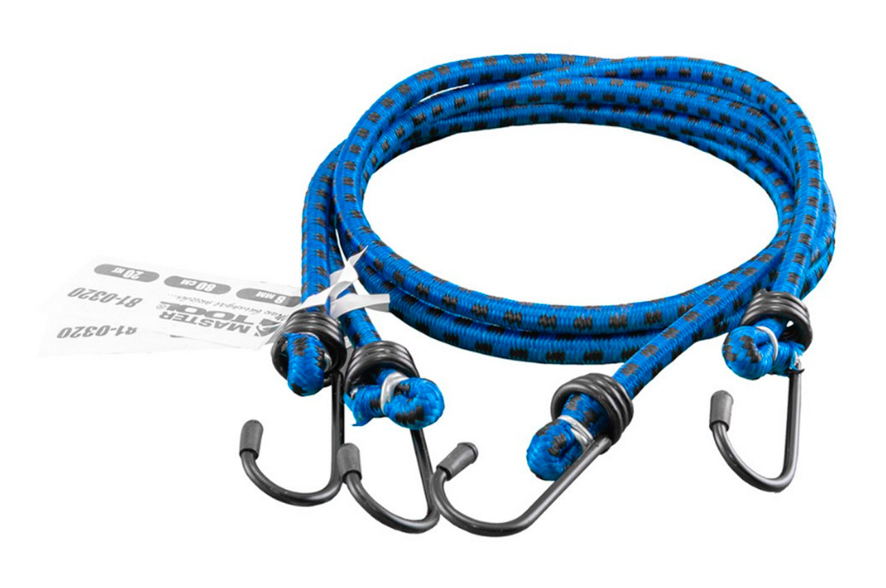 Резинки багажні Mastertool - призначені для фіксації вантажів під час транспортування. Використовуються в автомобілях, велосипедах, скутерах, мотоциклах, сумках-візках, тачках тощо. Довжина 80 см. Діаметр 8 мм.
