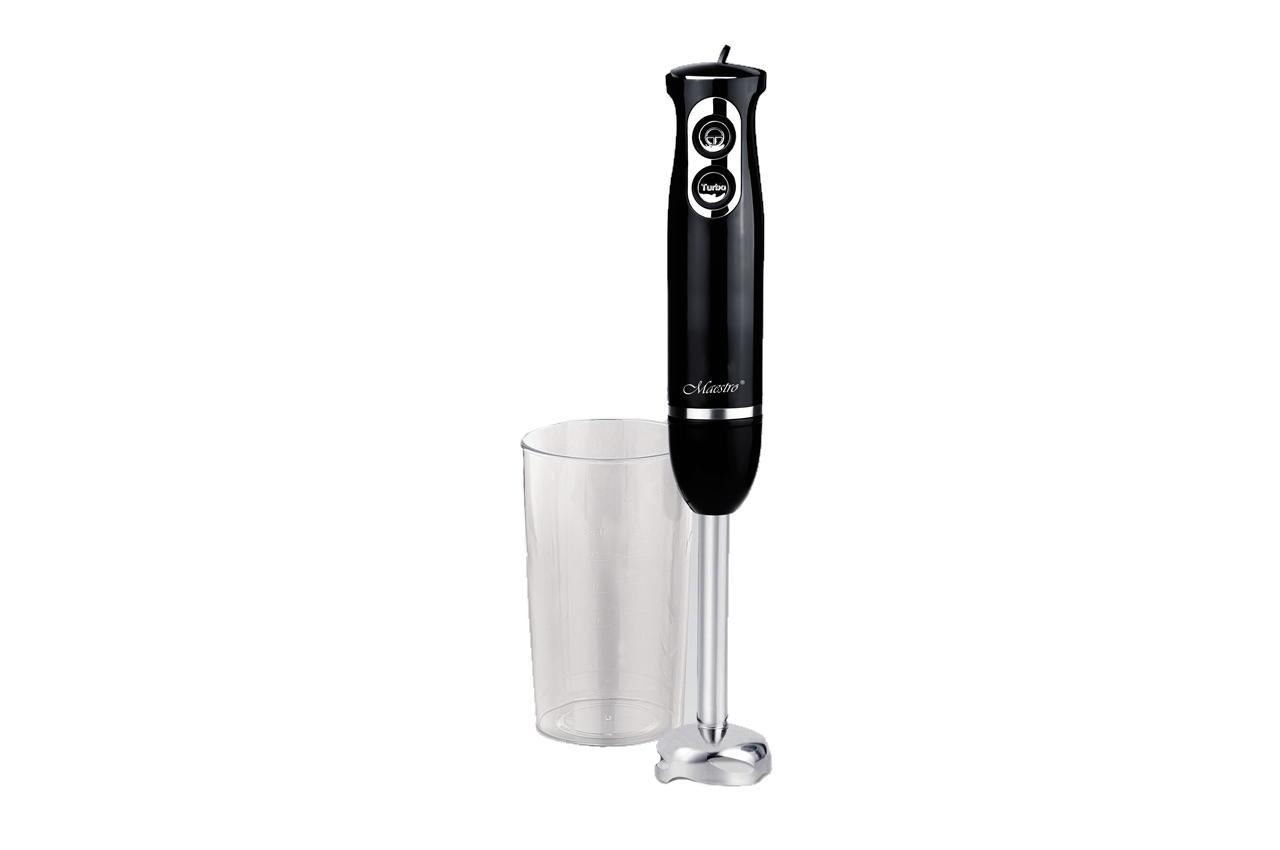 Ручний блендер Maestro MR 511 потужністю 350 Вт працює в двох швидкісних режимах, поставляється в комплекті з мірним стаканчиком об'ємом 600 мл, має чорний пластиковий корпус і ножі з нержавіючої сталі. т. п., а також для колки льоду